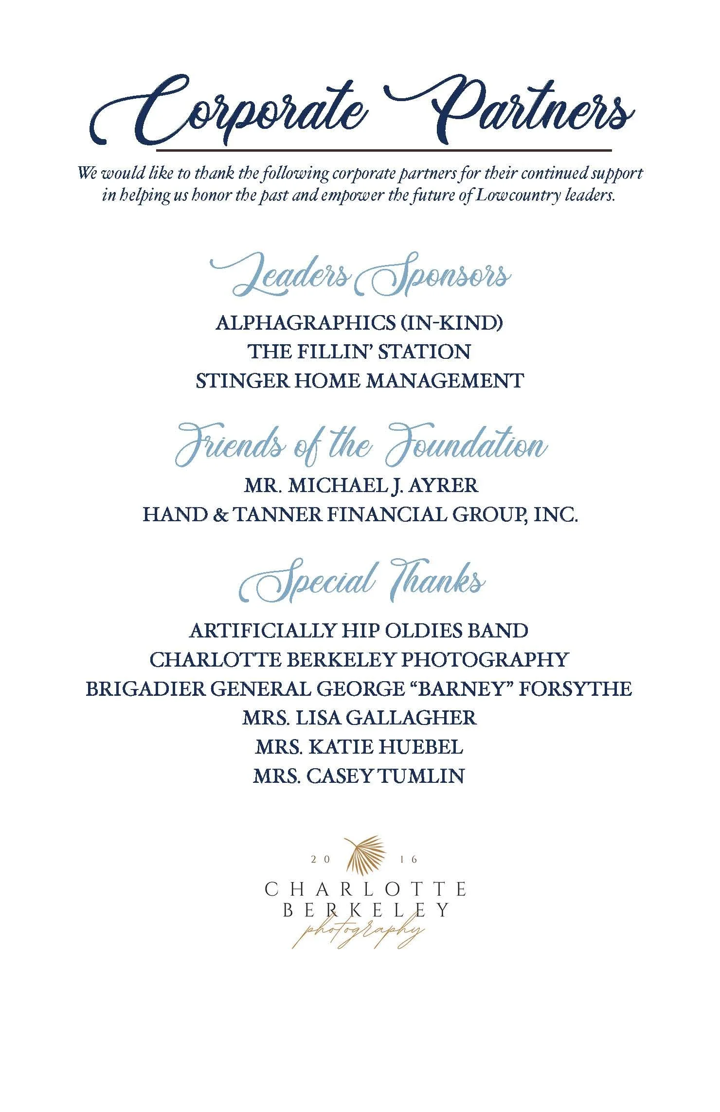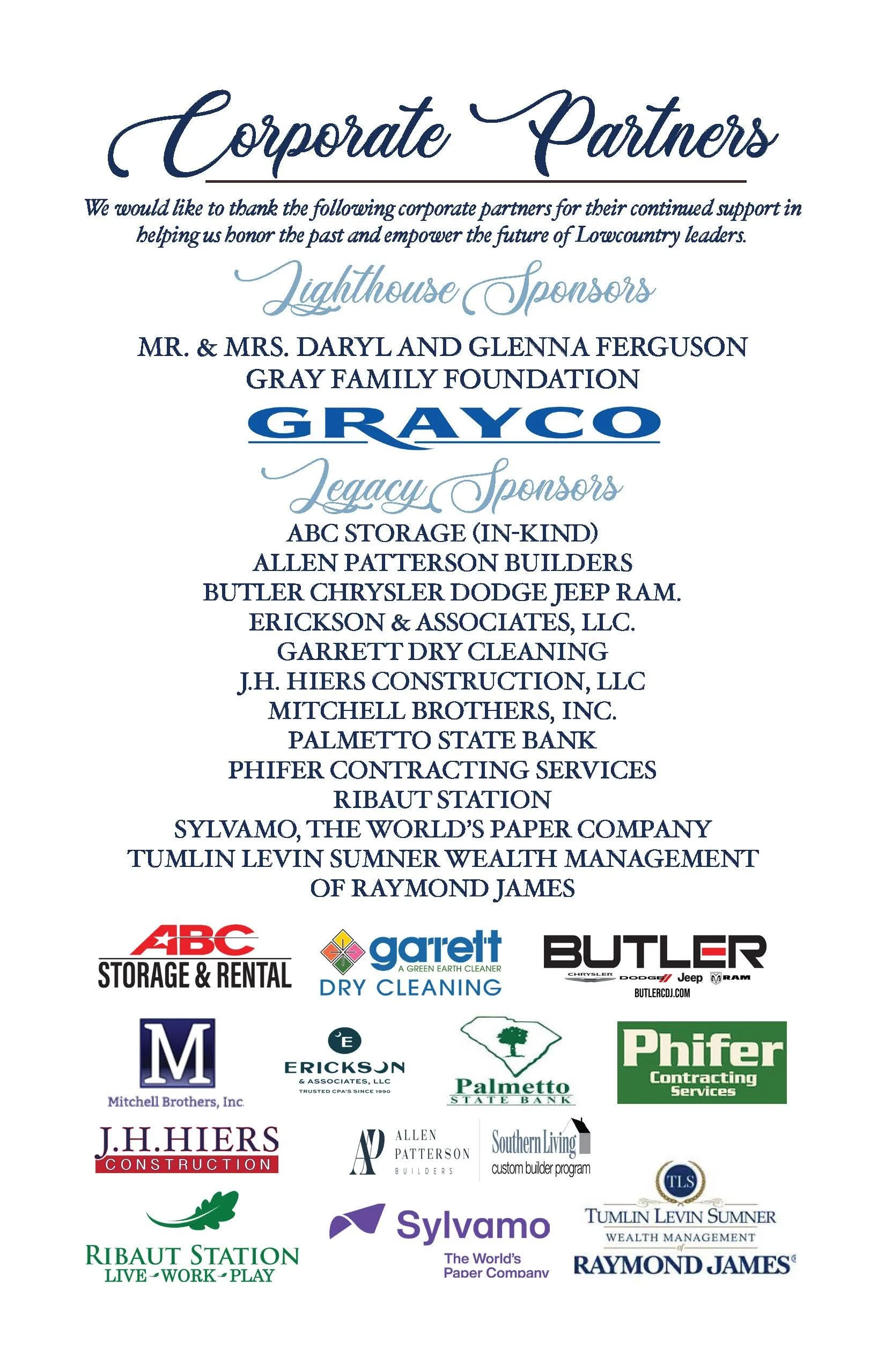 A VERY SPECIAL THANK YOU TO OUR CORPORATE PARTNERS OF THE 2026 LOWCOUNTRY LIFETIME ACHIEVEMENT AWARDS